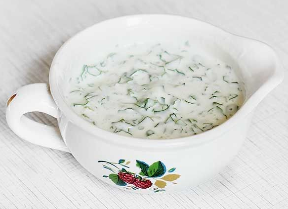 Step 4 Sauce: mix sour cream, mayonnaise, add mustard and crushed garlic as desired. Add finely chopped greens, mix.
