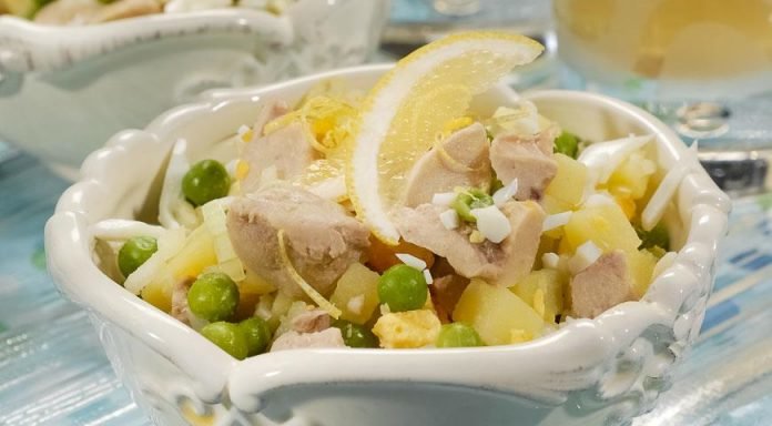 Step 8 Mix all the prepared ingredients, salt and pepper. Pour in vegetable oil. Sprinkle on top with proteins and arrange with lemon slices.