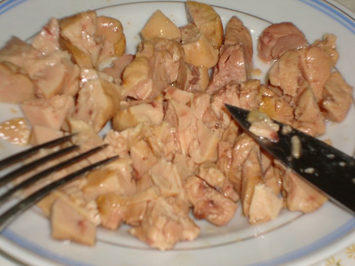 Step 3 Open a can of cod liver, drain the oil and cut the liver into small pieces.