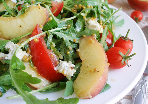 Step 8 Arrange the tomatoes and peaches on the arugula pillow and lay the remaining leaves of the arugula on top.