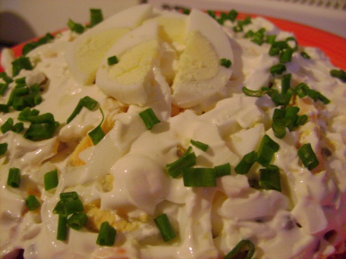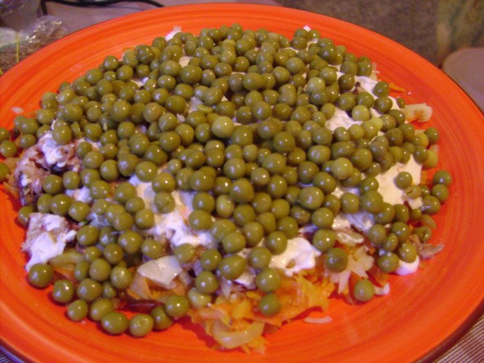 Step 4 The second layer of salad will be sardines. Put fish slices on vegetables, evenly distributing them on the surface.