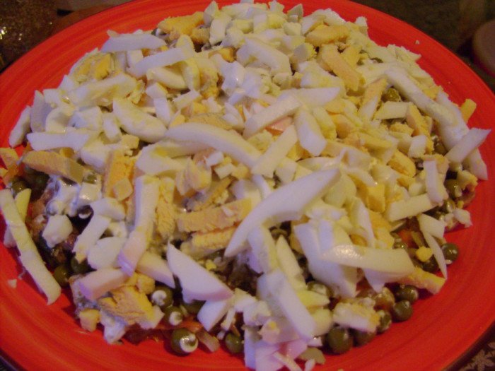 Step 7 The next layer of salad will be boiled chicken eggs. Put the chopped eggs on top (leave the half of the egg for decoration).