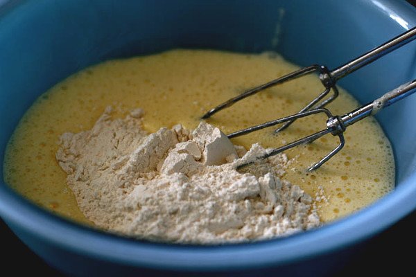 Step 2 Beat 4 eggs with a sugar mixer or whisk until pale yellow. The more the mixture is whipped, the more magnificent and softer the cake will turn out. Add vanillin, flour and mix gently with a spatula with movements from top to bottom.