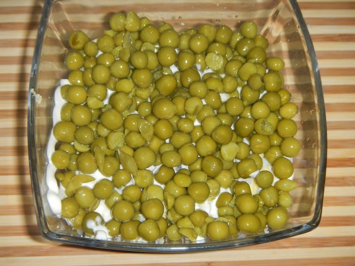 Step 8 On top of the peas, you can lay another small layer of the liver, which is also filled with mayonnaise.