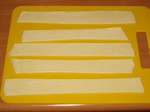 Step 1. Thaw the dough and roll it to a length of more than 30 cm., No thinner than 3 mm. With a sharp knife, cut the dough into strips 3-4 cm wide.