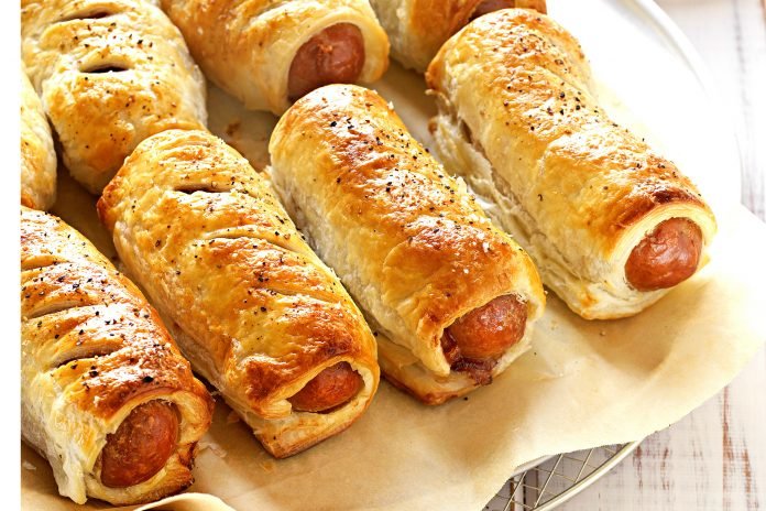 Step 2 Wrap each sausage with a strip of puff pastry, so that the last round partially overlaps the previous one.