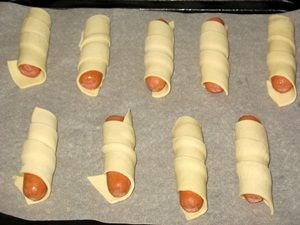 Step 3 Sausages wrapped in puff pastry put on a baking sheet covered with parchment paper. Grease with egg yolk.