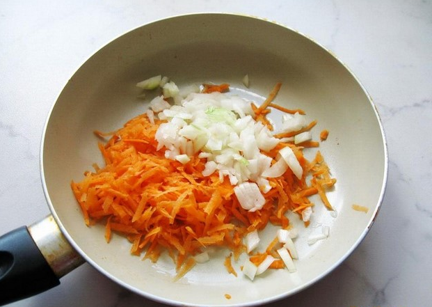 Step 3 Peel, wash and grate the carrots. Peel and finely chop the onion. Pour the vegetable oil into the pan, put the carrots and onions, lightly stew for about 10 minutes.
