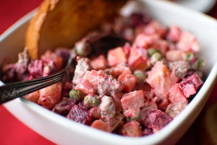 Step 7Add aromatic beetroot salad with beef mayonnaise, salt and serve immediately.