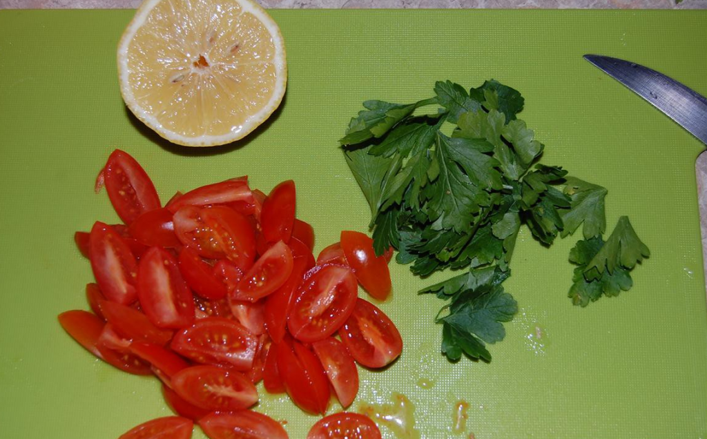 Step 2 Wash tomatoes, cut into 4 parts. Prepare parsley leaves.