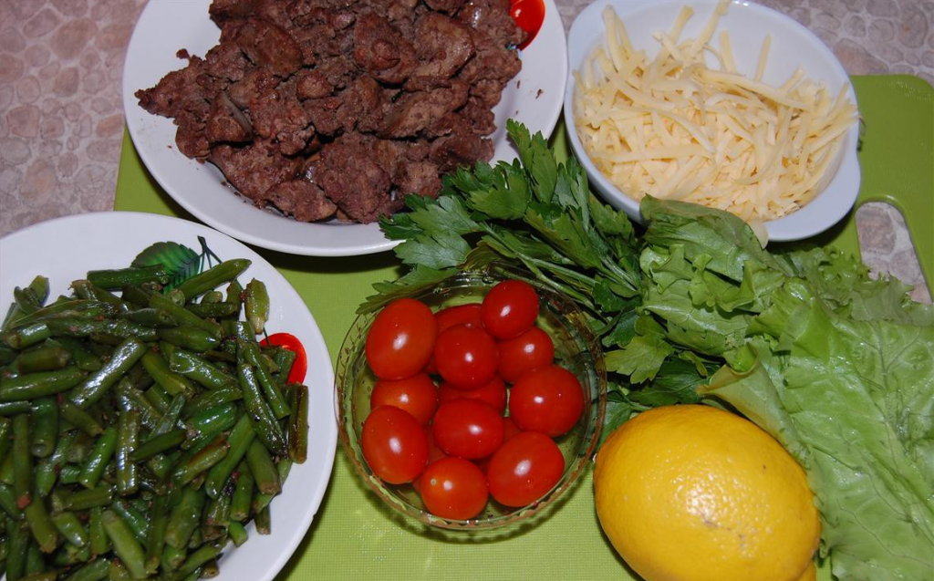 Step 1. Rinse the chicken liver, dry and cut into small pieces. Fry in a pan, salt and pepper. Defrost green beans, simmer in a pan and lightly fry. Grate the cheese on a coarse grater.