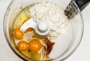 Step 1. Put cottage cheese, sugar, eggs, salt, vanilla in a blender bowl.