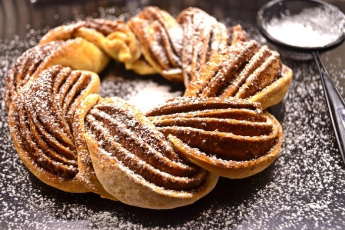 Step 12 Send the prepared wreath of dough into a preheated oven to 175 degrees and bake for 30 minutes. Cool aromatic pastries, sprinkle powdered sugar over the wreath.