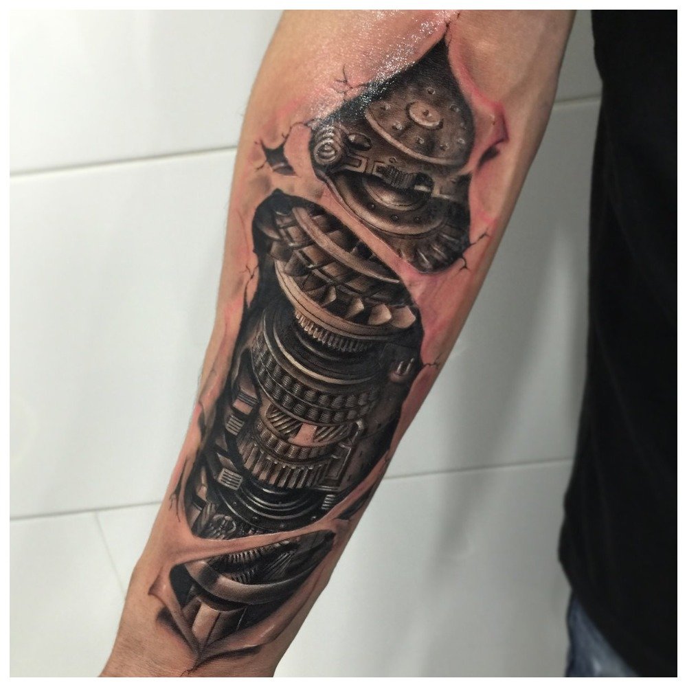 A new direction of drawings for tattoos, which is chosen by brave and decisive men. The quality work of the tattoo master will create the impression that you are made of metal, parts of which protrude through the skin.