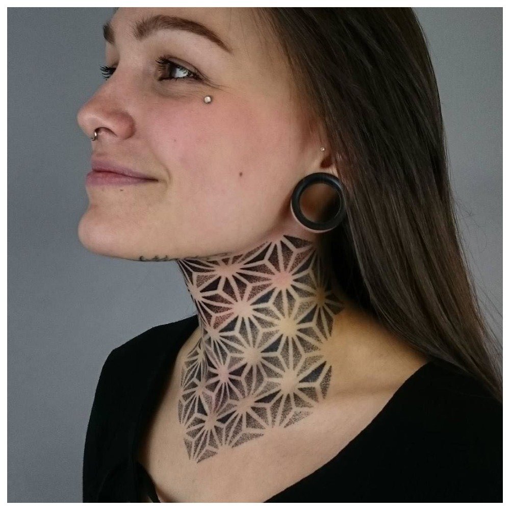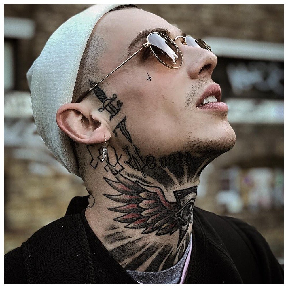 - tattoo on the side of the neck with a transition to the shoulder;