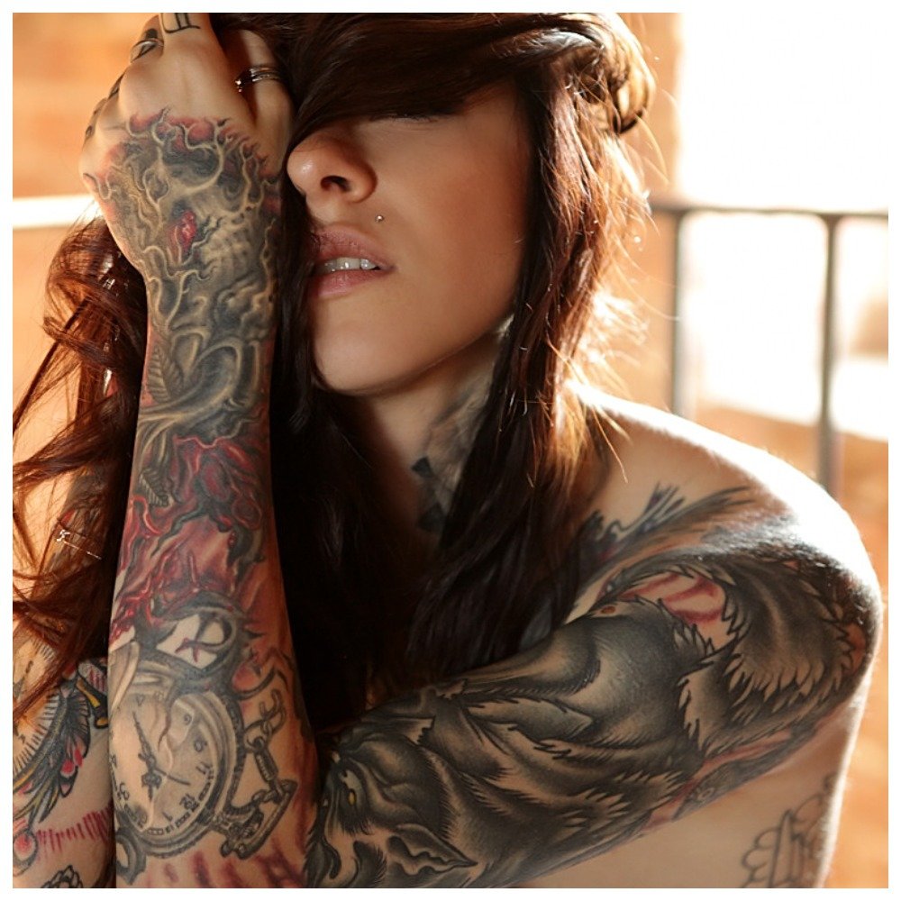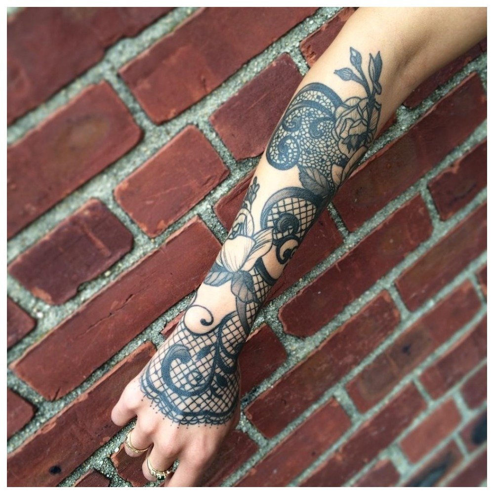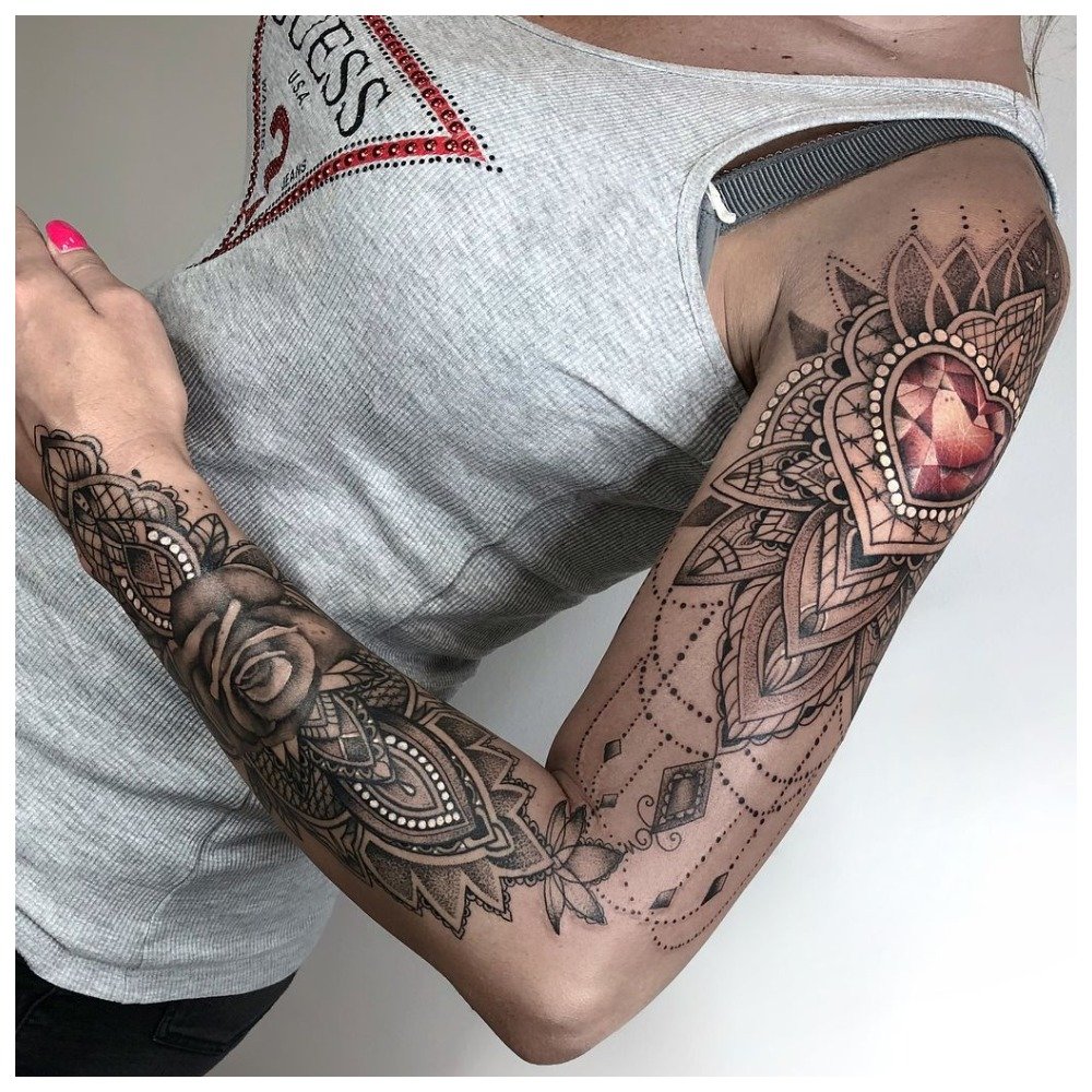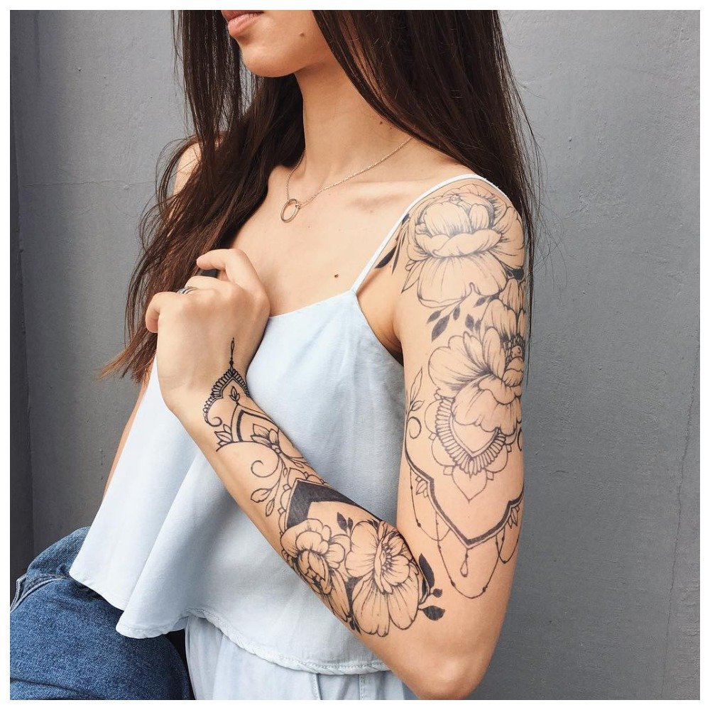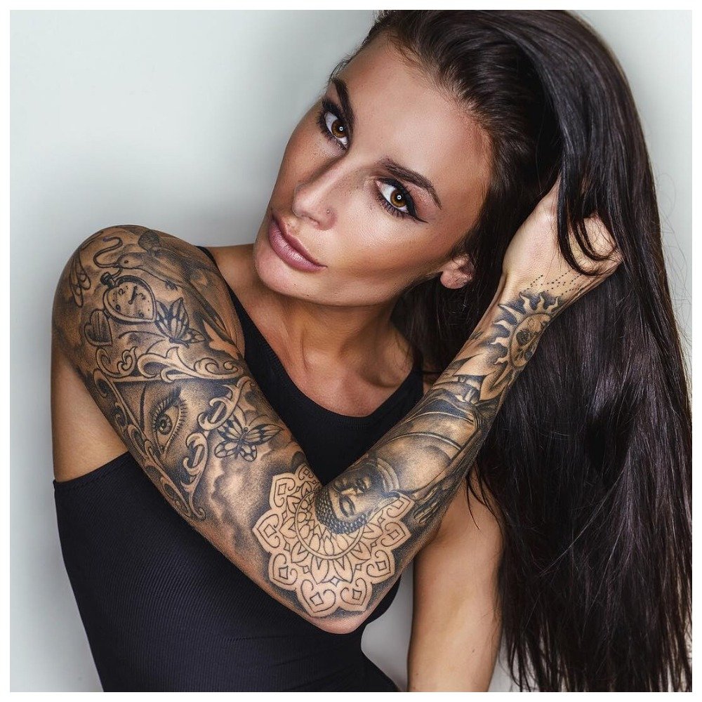 As a drawing for a full-arm tattoo, flower symbolism, a portrait are mainly used, or a certain story is told. In most cases, it is necessary for the girl to explain the meaning of the tattoo, because it is ambiguous.