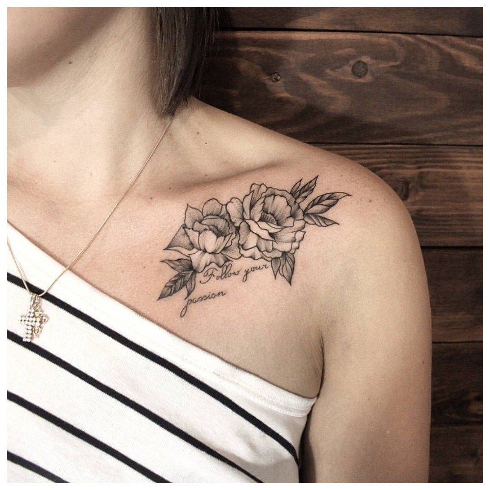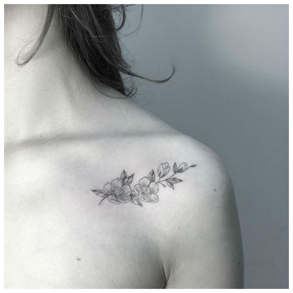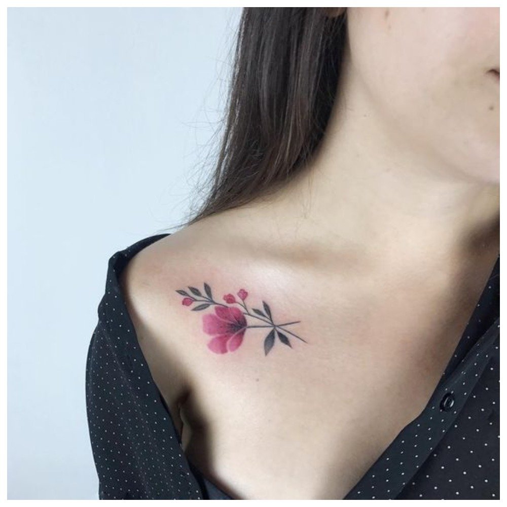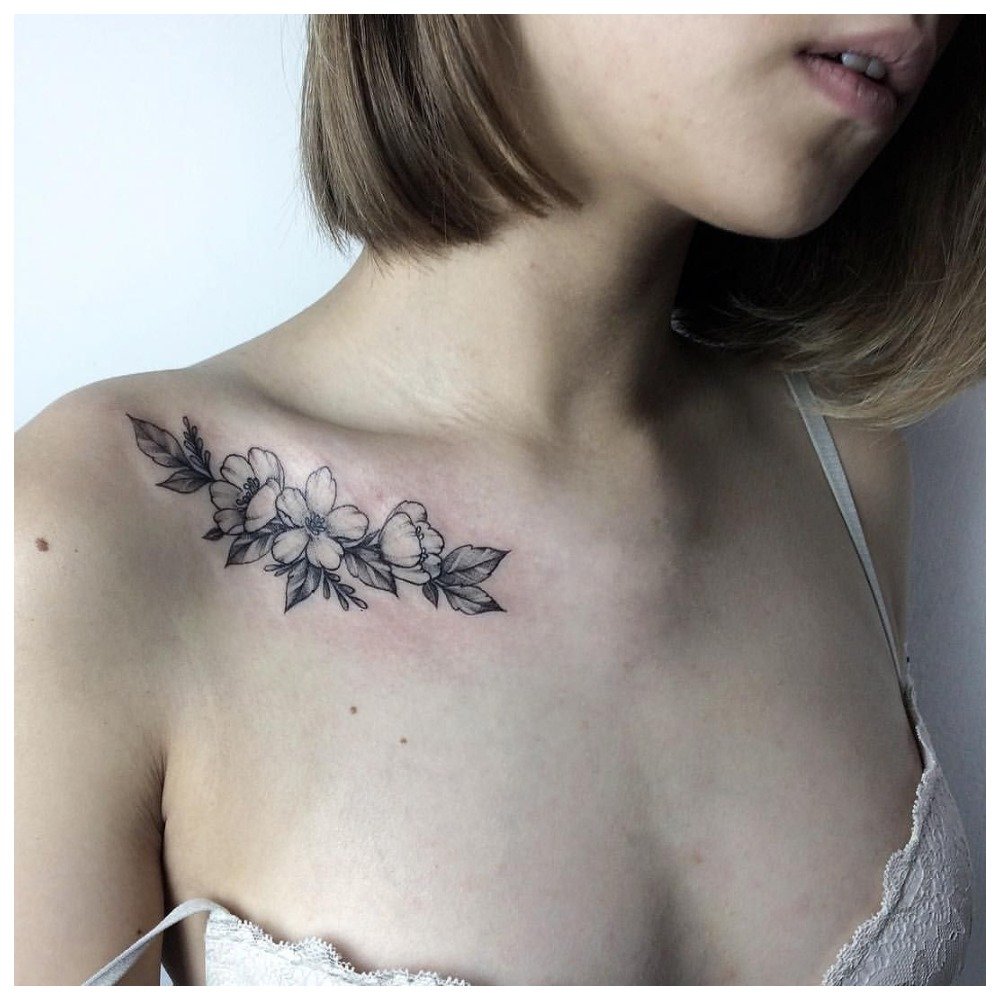 Tattoos that look along the clavicle in the direction of the shoulder look best. This is often a twig, inscription or delicate flower. A larger drawing usually captures part of the shoulder, as it requires more space.