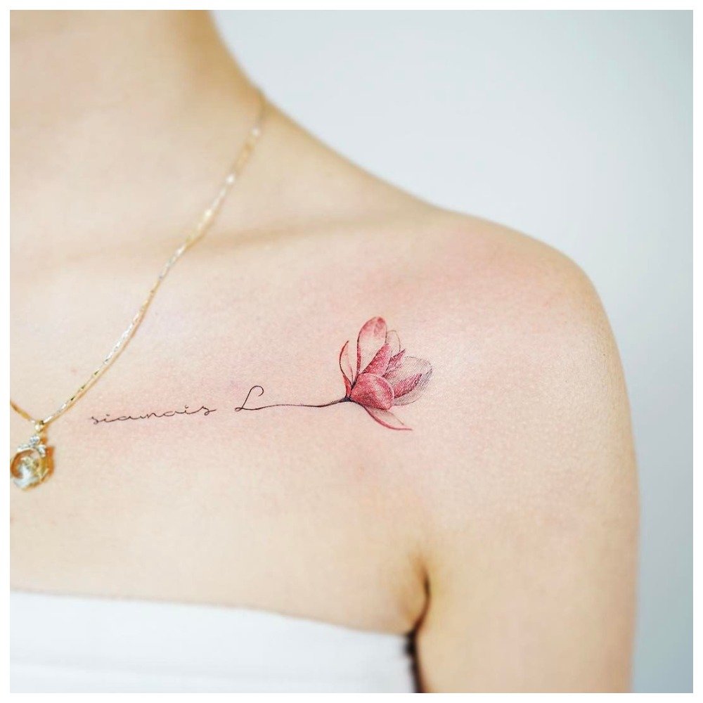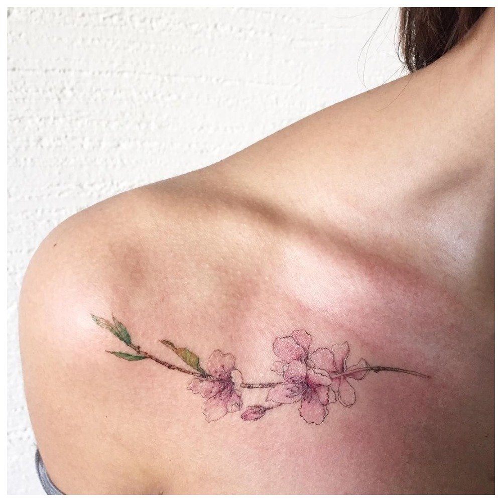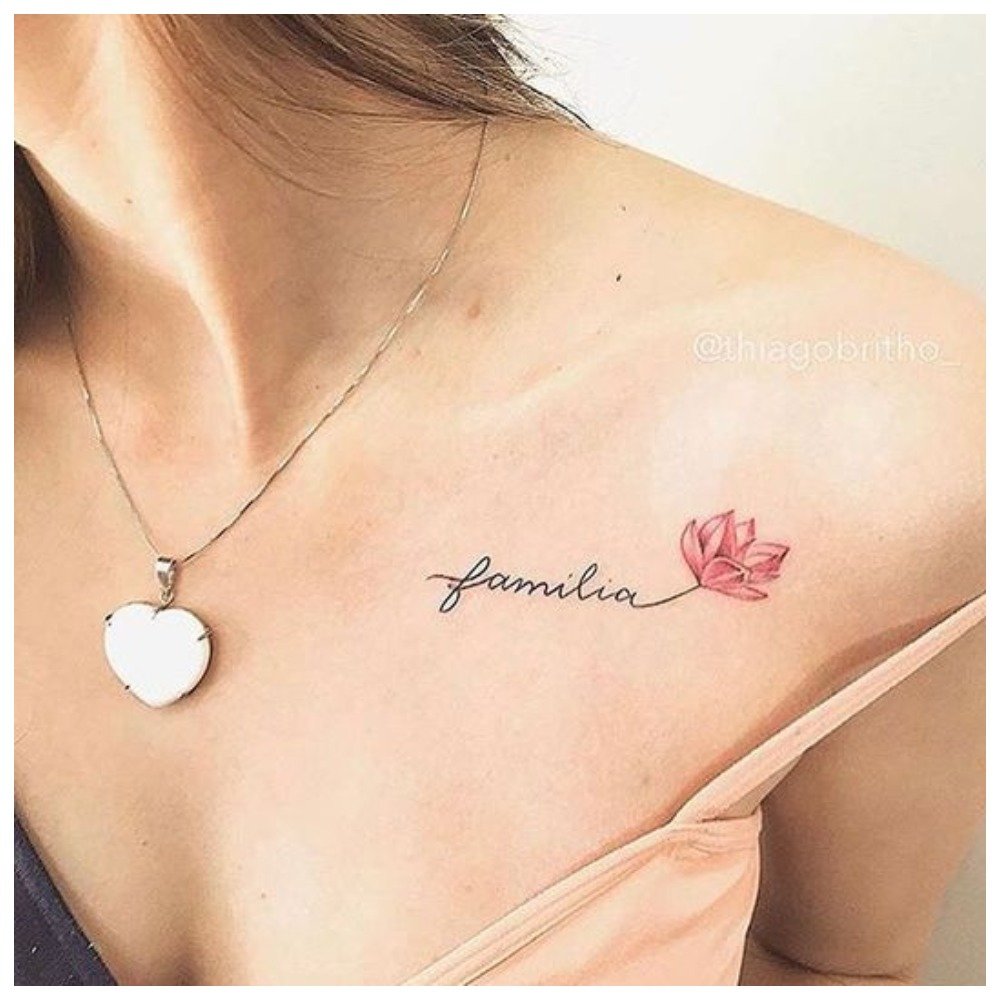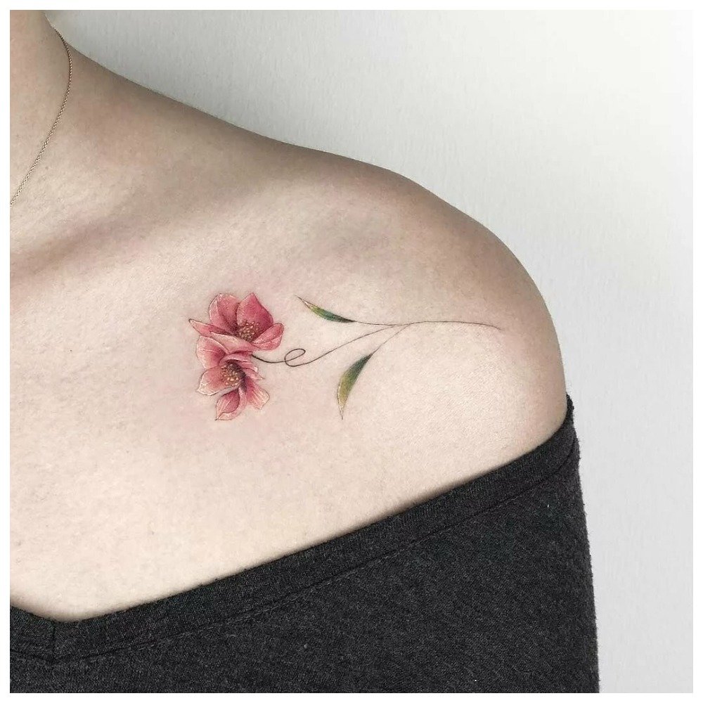 Tattoos that look along the clavicle in the direction of the shoulder look best. This is often a twig, inscription or delicate flower. A larger drawing usually captures part of the shoulder, as it requires more space.
