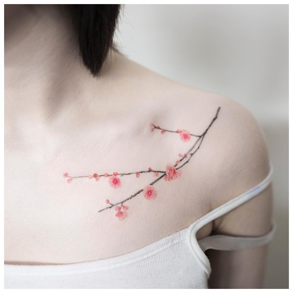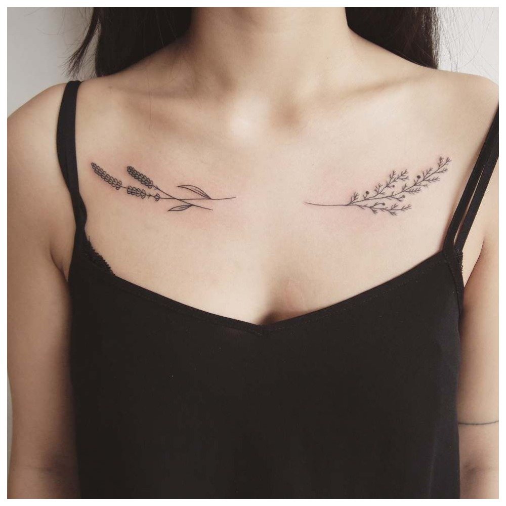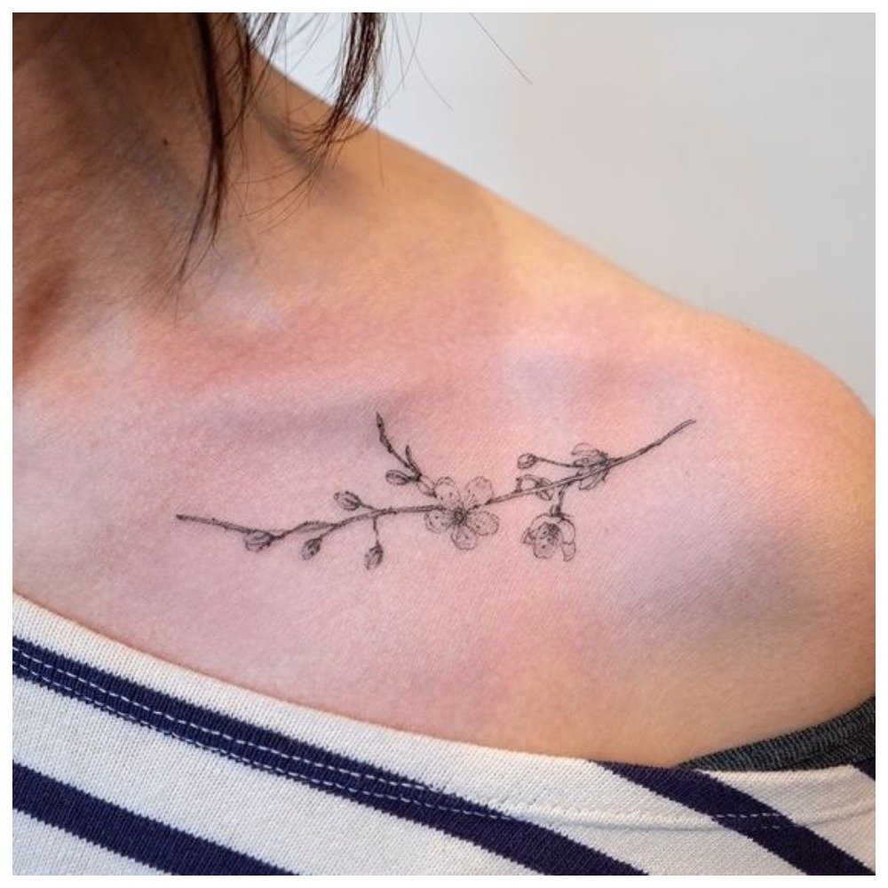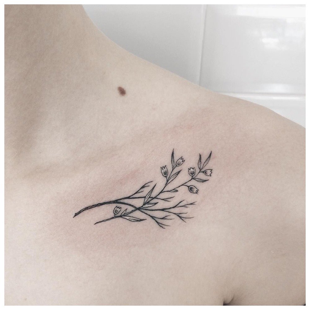 Twig Tattoo on the collarbone does not carry any special meaning. Such a picture is chosen by girls who want to emphasize their feminine.