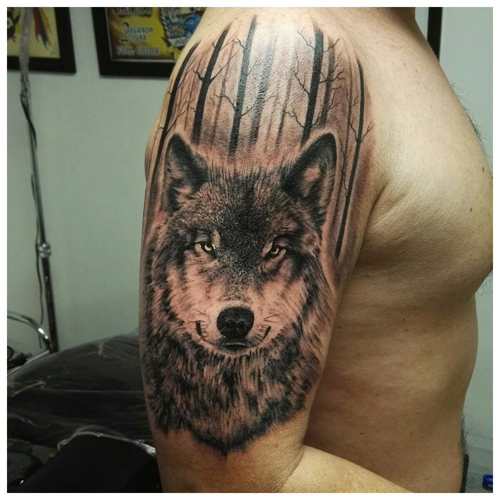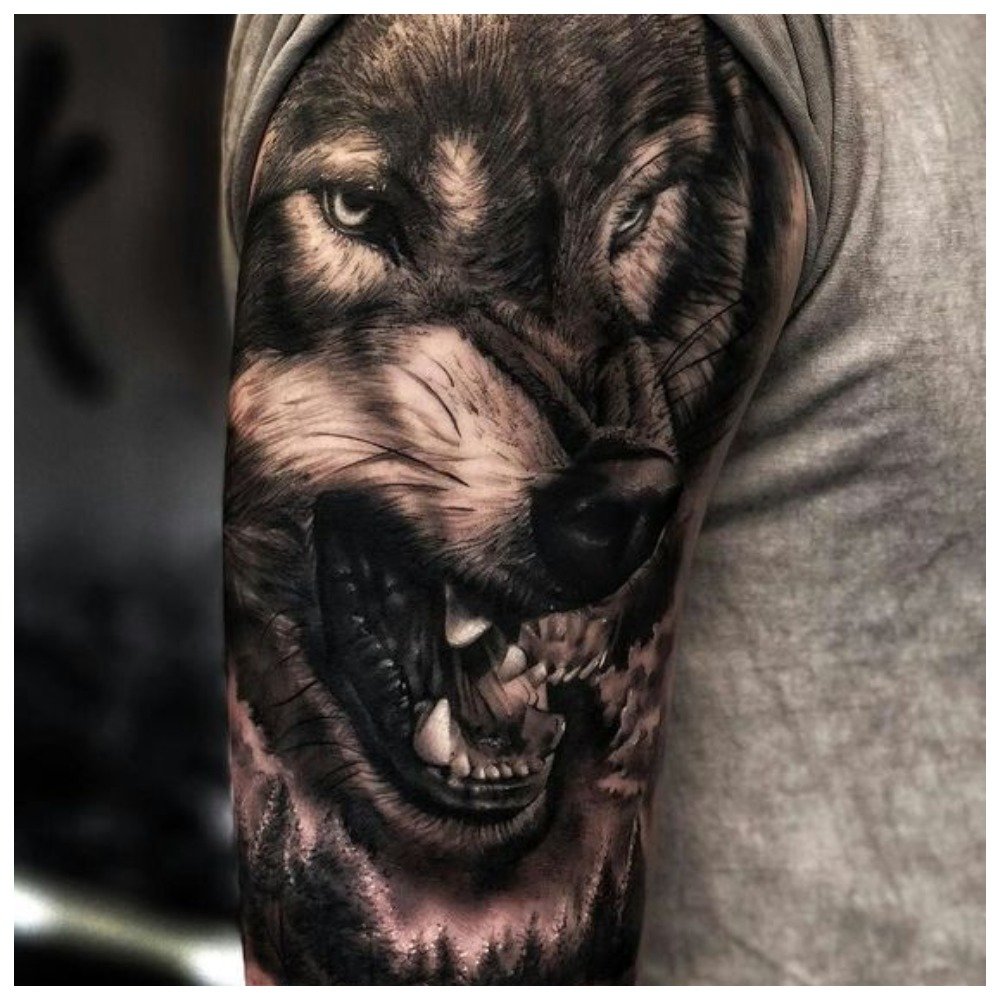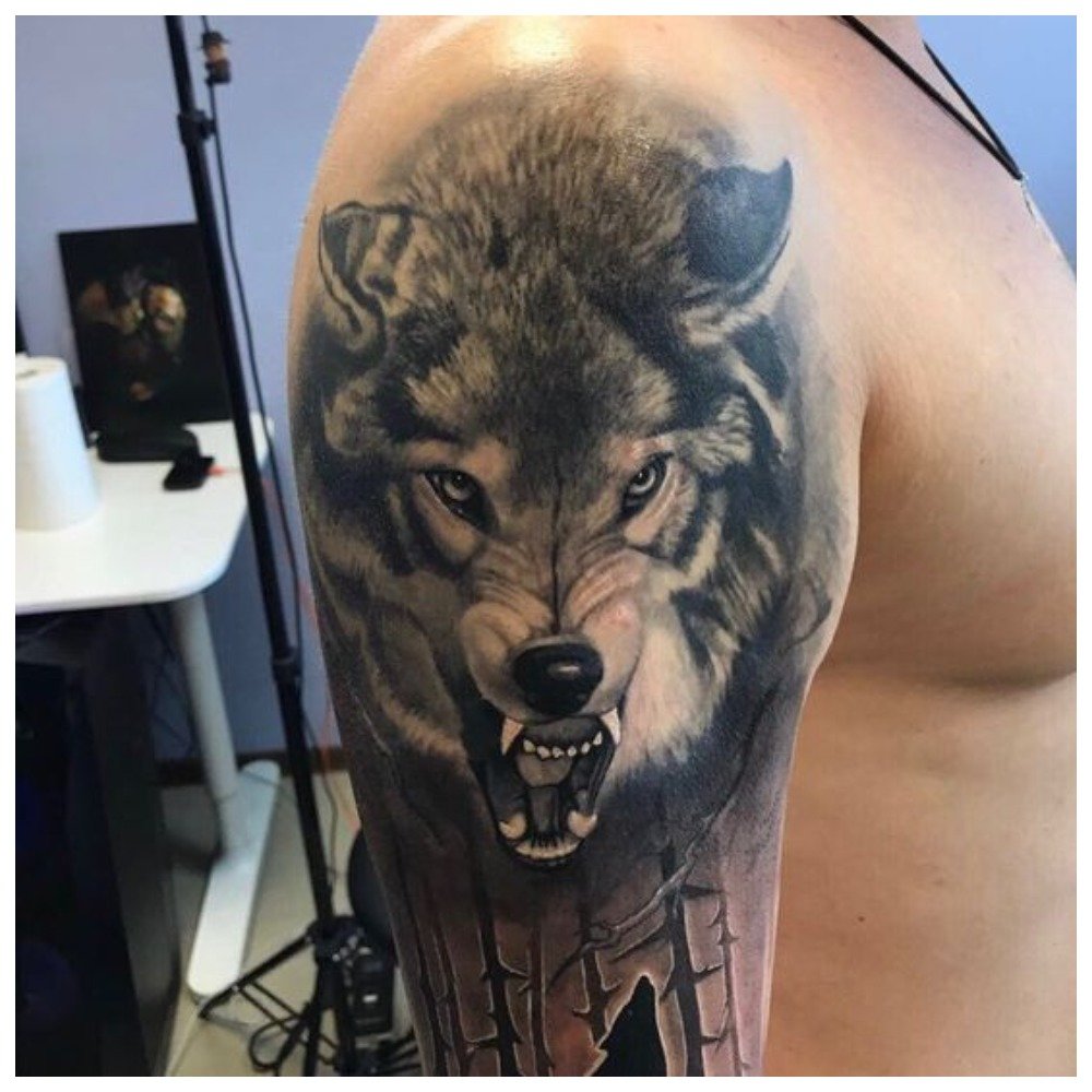The large area makes the shoulders a favorite place for a wolf tattoo. It can be just a cleft palate, a grin, a crouching wolf or a wolf cub howling at the moon.