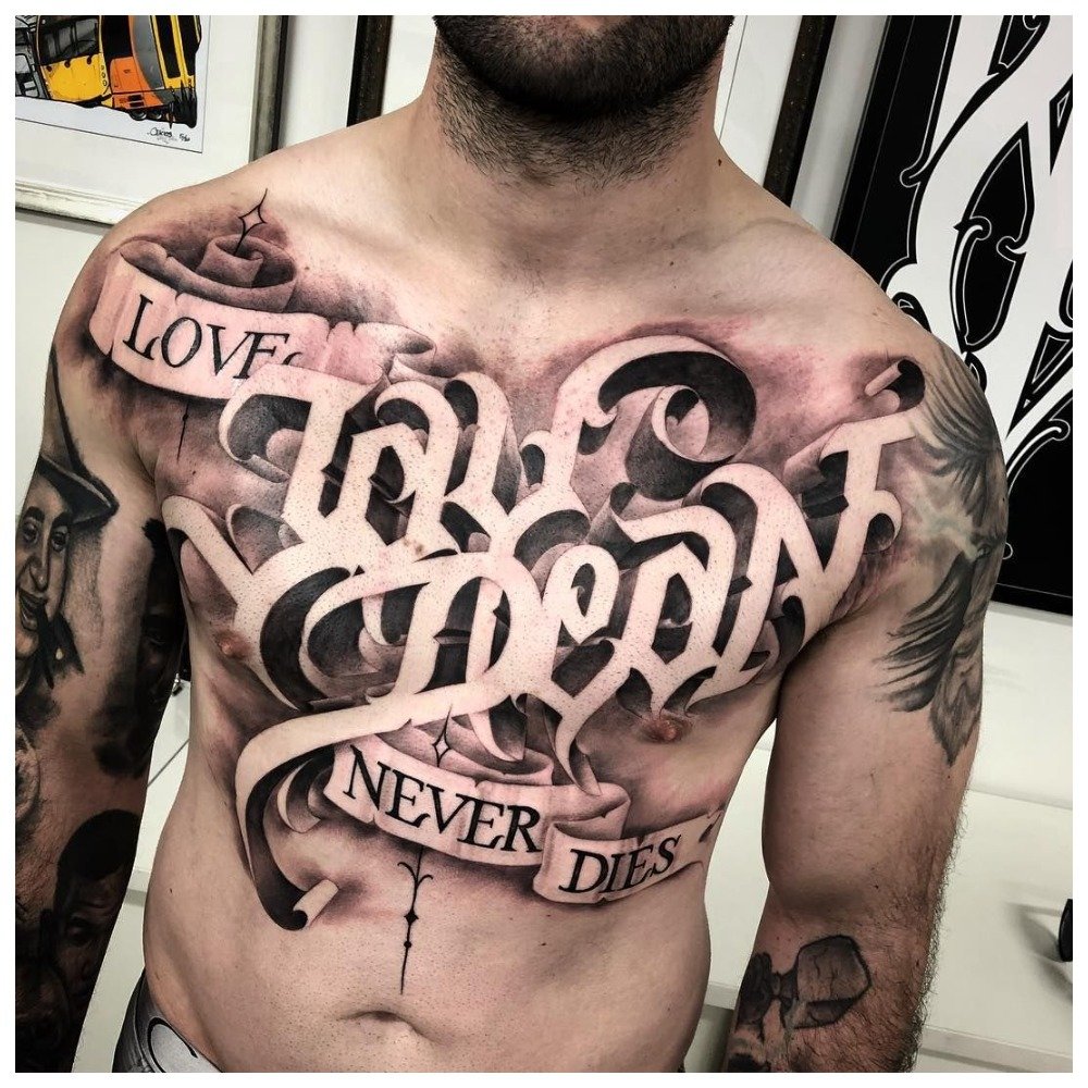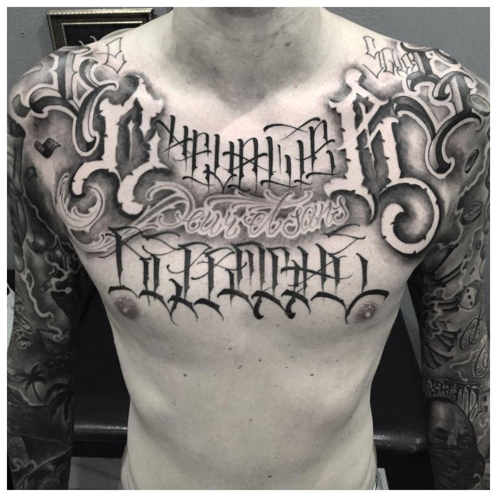 Initially, a small tattoo will be inscribed on the chest of a man. This may be an important quote, slogan, name of your beloved. Moreover, it is not necessary that the quote be in a language that everyone understands. It can be Latin. In this case, the emphasis is on the beauty of the design of the tattoo, and not on the meaning.