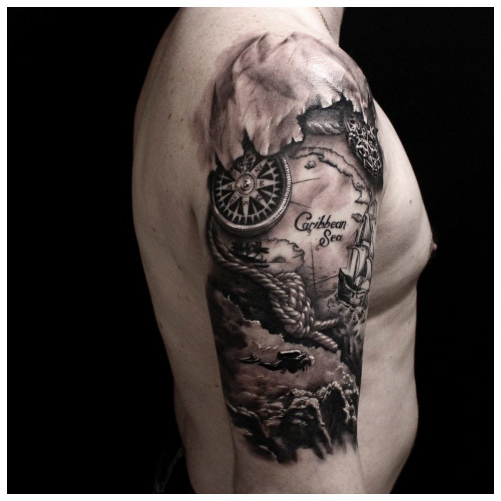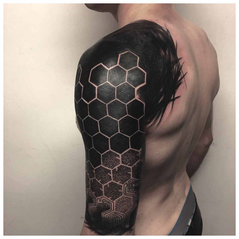 Large tattoos look very harmonious on the male shoulder. And no matter what style they are made in. This can be blackwork, and Japanese drawings, and even a contour tattoo.