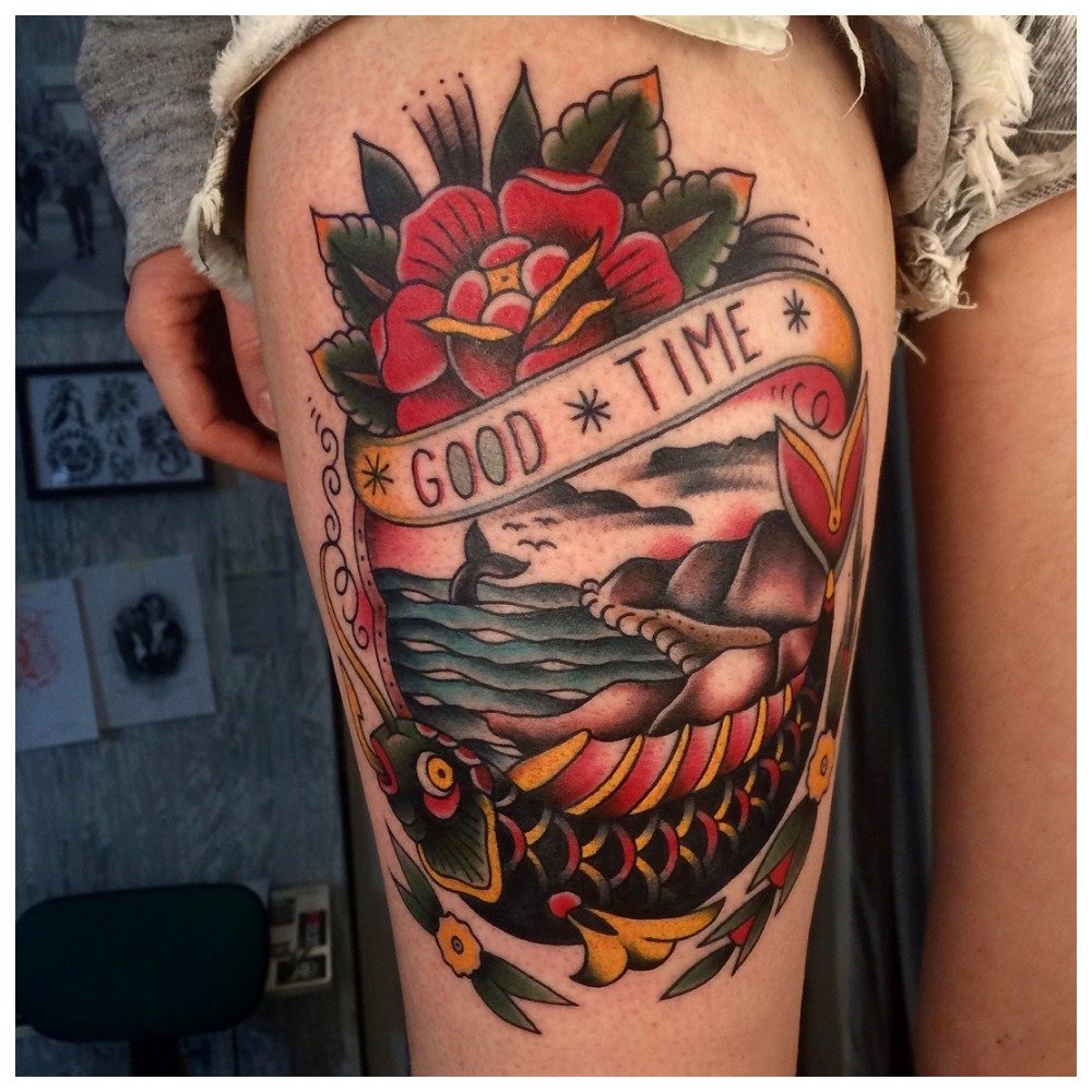 Mostly tattoos are performed in color with black and white elements. The background is usually a stained glass ornament or waves (if fish are stuffed), a little less often - fire.