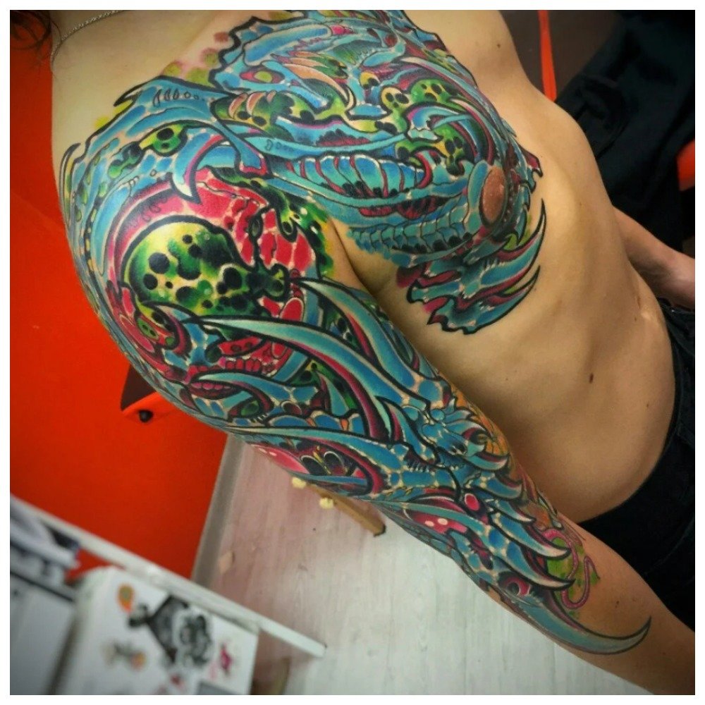 The main goal of such a tattoo is a negative impact on the psyche. That is why this style is less and less in demand.