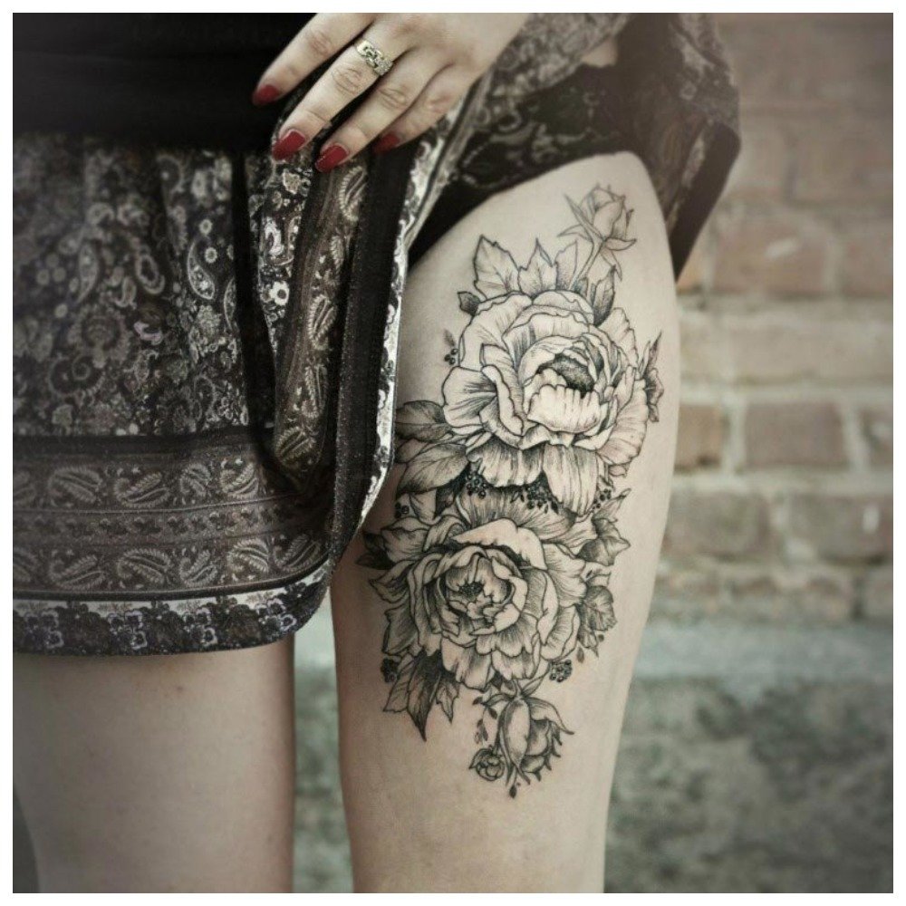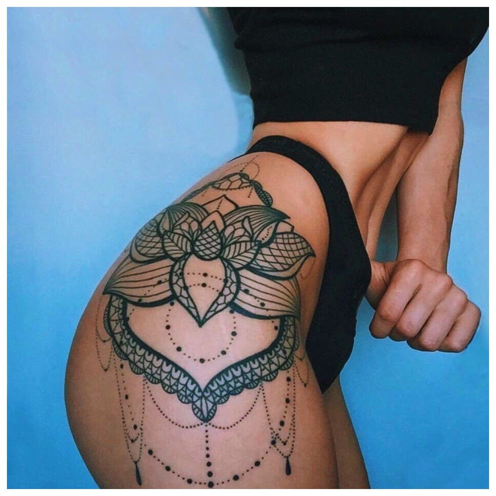 Another popular type of pattern on the hip is a tattoo on the back of the leg, namely, directly under the buttocks. Such tattoos look very seductive and, moreover, can be made in absolutely any style you like.