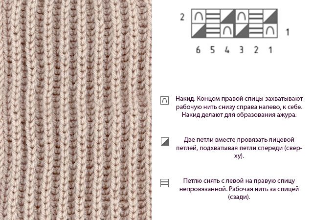 5 row: knit with a dark thread - Attention! We knit to the opposite end of the knitting needle * 1 stitch together with the yarn with a knit stitch, 1 yarn, 1 knit stitch *, knit 1 stitch with a yarn together with a knit stitch with a knit stitch. 2-5 rows are repeated.