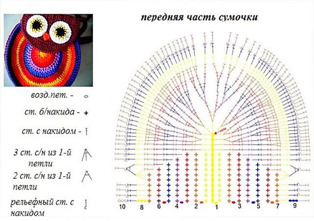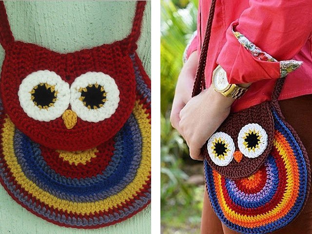 A multi-colored bag owl crochet for stylish and courageous girls knits quickly and easily.The size is easily adjusted (take the strings thicker or just add a couple of extra rows at the end).