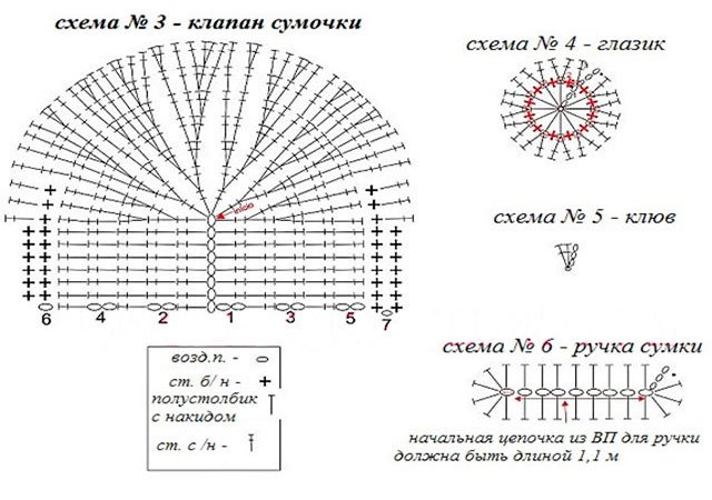 Harness: knit with connecting posts along the side of the part to the first row of the head / beak, turn, 3 tbsp. s / n in the loop of the first row, knit st. s / n back along the side of the part to the 7th row, Art. s / n in the 7th row, 5 military units, Art. s / n in the 7th row, knit st. non-cash along the second side, 3 tbsp. s / n in the loop of the first row. Finish work.