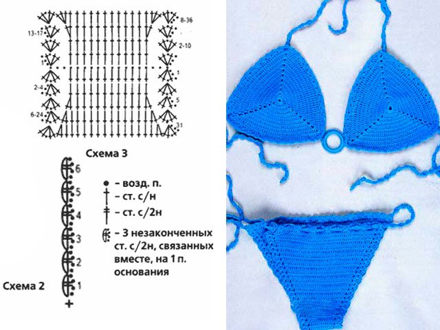 Bikini again fit in two sets: at first back part. 15 V.P., 4 R.S.B.N. After this, add in each 3 R. 2 times 1 P., in each 2 R. 16 times * P. After that, in each R. 22 * 1 P. 4 the next R. directly, close according to scheme 2.