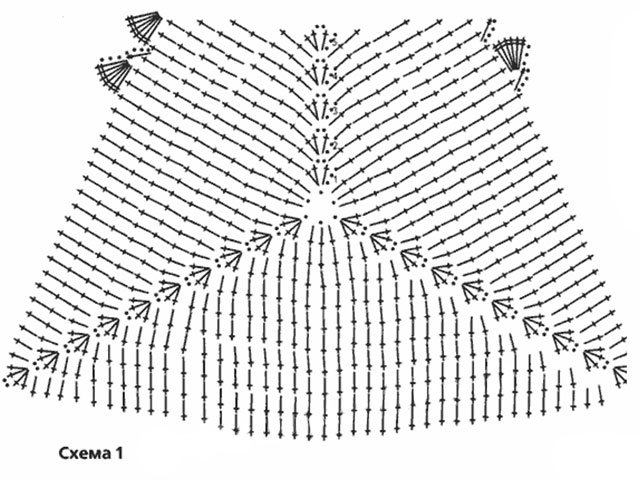For the back dial 93 V.P. + 3 V.P. = 14 rapports + ½ rapport on each side, not forgetting the start and end loops. When 52 centimeters are ready, skip 1 rapport on each side for armholes. Finish 4 cm at 10 rapports. Before do the same, but at a height of 4 cm leave room for the head - 8 rapports. At both sides tie another 32 cm. To assemble the product - use side seams, straps and lace.