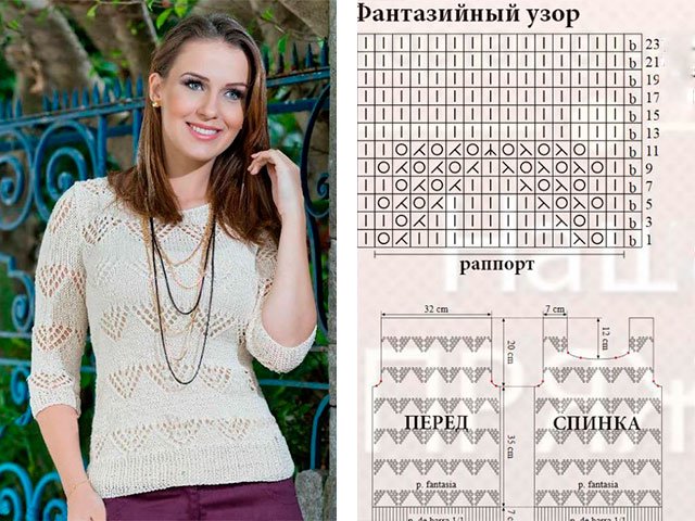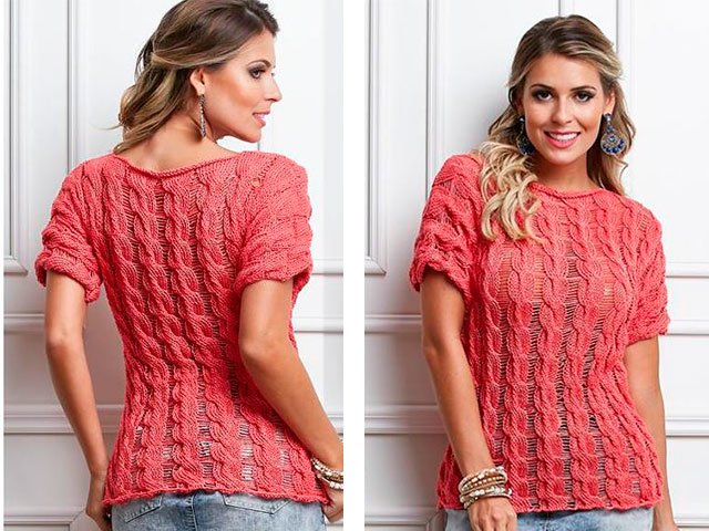 Beautiful openwork pullover with braids. - quite a summer and a simple option. This stylish option can be combined both with shorts in the summer, and with jeans in the fall and in the spring. You can wear a light cardigan, denim jacket or a delicate jacket from above. This knitted cotton pullover is also suitable for pregnant women.