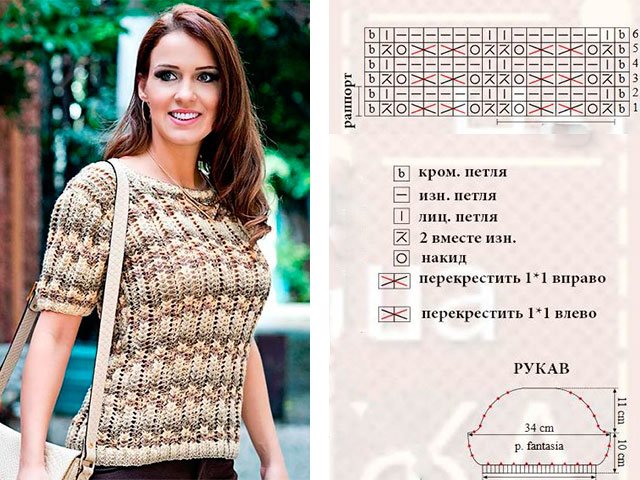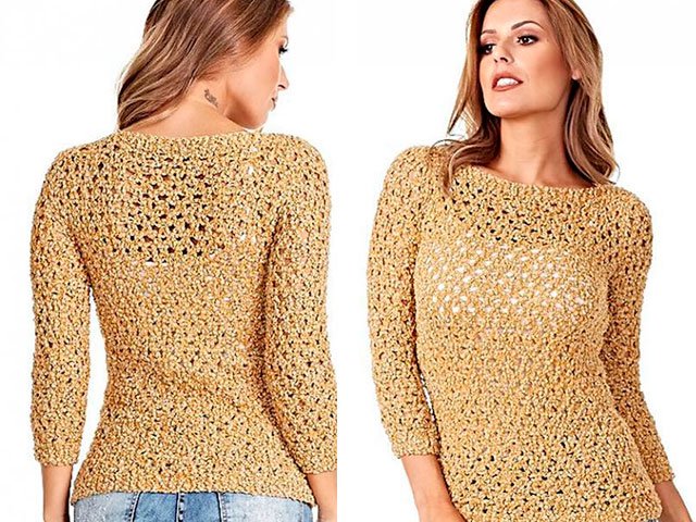 Golden summer yarn pullover, the scheme and description of which is only in our article! This is a rather warm thing, although it is summer. In the evenings it will be very comfortable and convenient. Our size is 38/40.