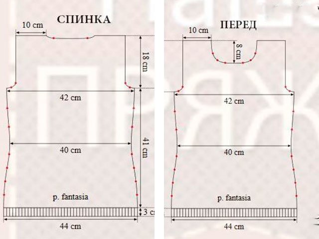 front part also begins with tool No. 4,5 and 98 P. we also knit 3 cm with an elastic band 2 * 2, 5 mm knitting needles in C / X. On each side of U.B. 1 P. * 4 in each 12 R. 12 R. without U.B., in each 12 R. - P.R. 1 P. * 2. For armhole - we close in each 2 R. on the sides 3 P. * 1, 2 P. * 1, 1 P. * 1 at 44 centimeters. To make a beautiful smooth neckline - close in 10 centimeters 12 medium P. The sides - separately. On both sides of the neck in each 2 R. - close 5 P. * 1, 4 P. * 1, 3 P. * 1. At 18 cm - we close the entire product.