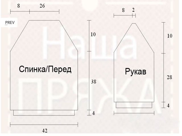 Sleeves: 60 P. rubber band 2 * 2 - 6 R., P.R. 12 P. after the last R. gum. Larger Knitting - by s / x with P.R. on the sides in each 4 R. 1 P. * 2. Close by 10 cm on the sides in each 2 R. 3 P. * 1, 2 P. * 1, 1 P. * 10, 4 P. * 3, 5 P. * 1. To close.