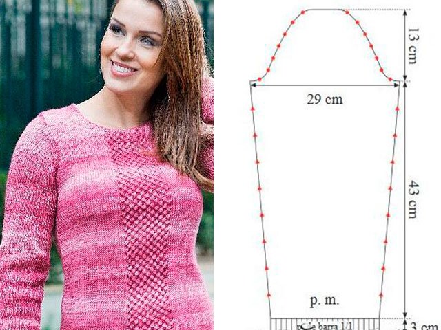 Sleeve: 45 P. with an elastic band 1 * 1 4 cm. Then we continue with a pattern, P.R., from each side 1 P. * 4 in each 12 P. At 24 cm from each side in every second R. 3 P. * 1, 2 P . * 2, in each 4 R. 1 P. * 5, in each 2 R. 4 P. * 2. We close.
