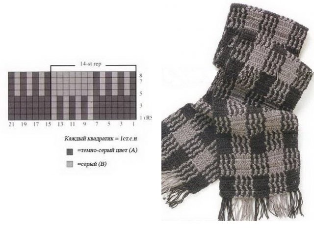 We chose a not complicated knitting pattern for the classic scarf model, so any novice needlewoman will be able to cope with the description. To knit a classic model of a male scarf, we need: yarn - 50 g. Of dark gray and 50 g.light gray hook number 3.
