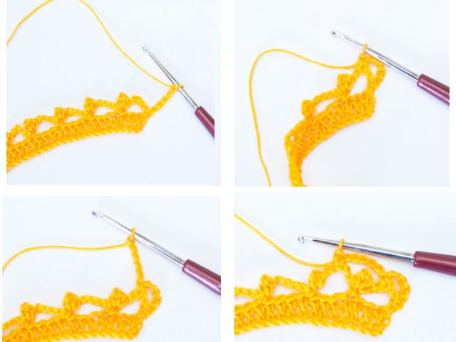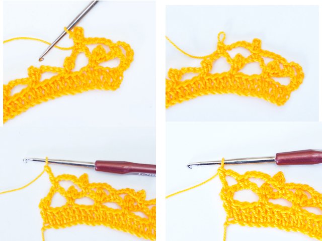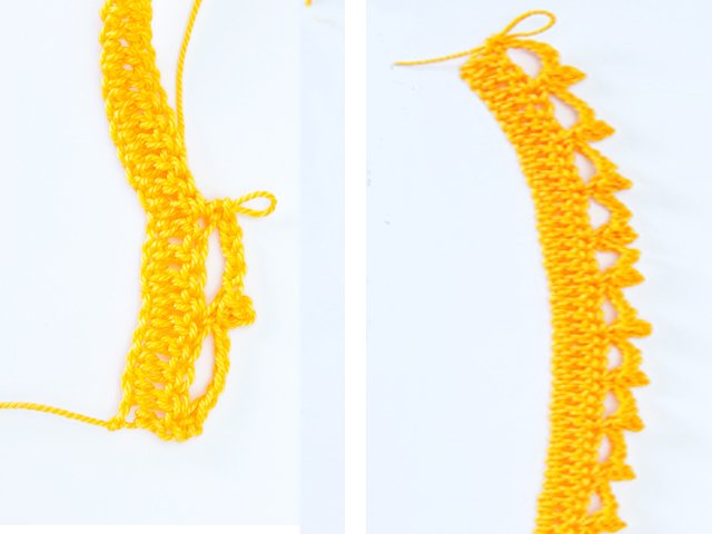 3 loops are skipped and in the 4th we knit 1 st.s.b., repeat the pattern from picot to the end of the river.