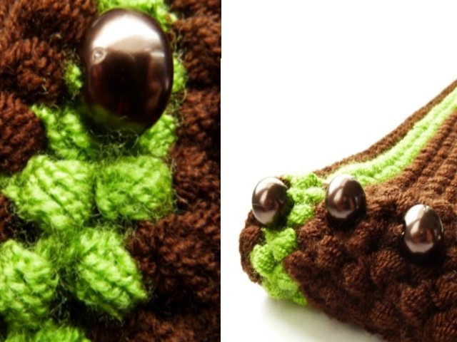 2. Change to green and make 3 vp, knit 2 and 3 p. green threads.