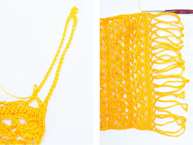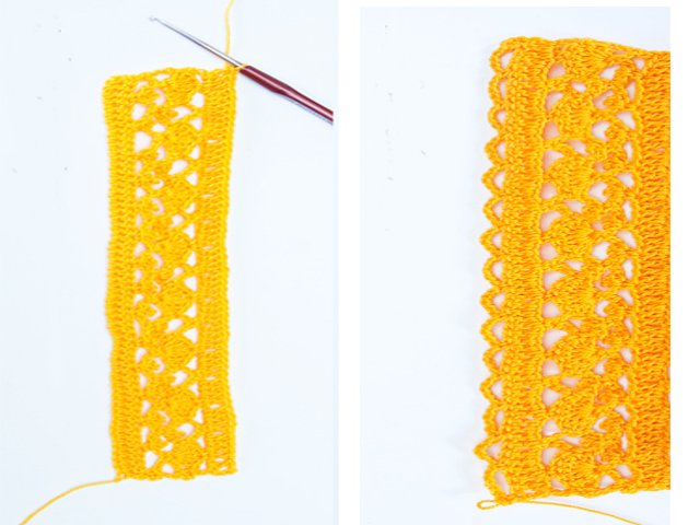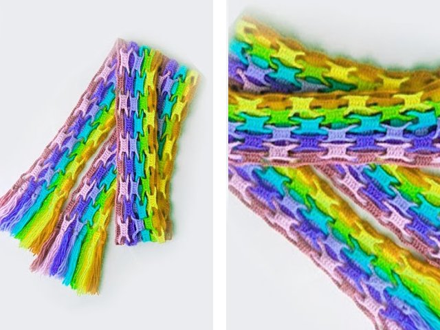 6. We make the river. to the end of the scarf. The last r. close the loop. We decorate the scarf with bows.