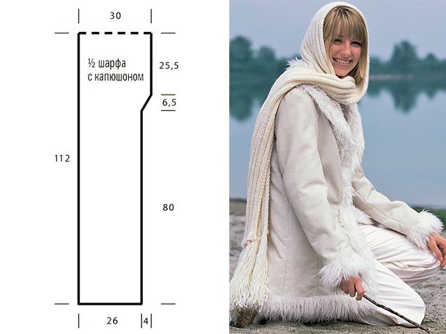 Such scarf - hood Will look great on any girl and woman. It is long, beautiful and very warm. In addition, it replaces the header, i.e. 2 in 1! We chose 400 grams of white yarn.