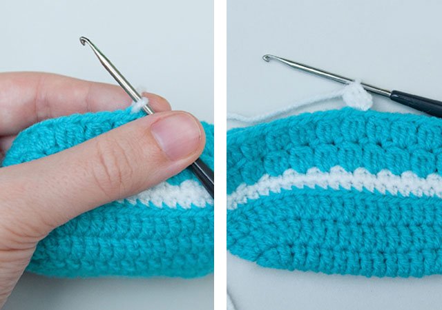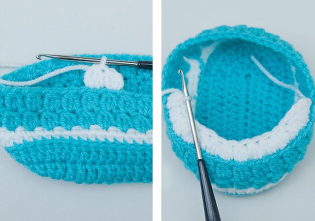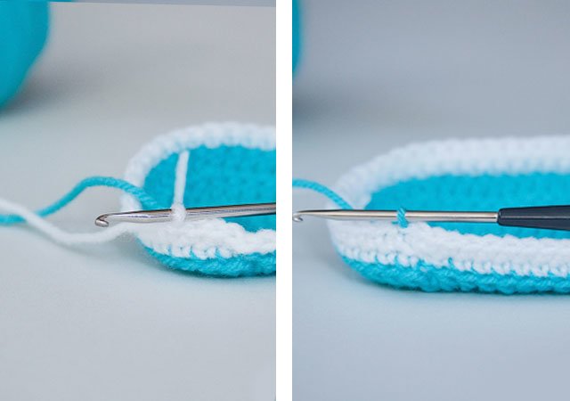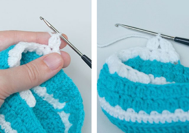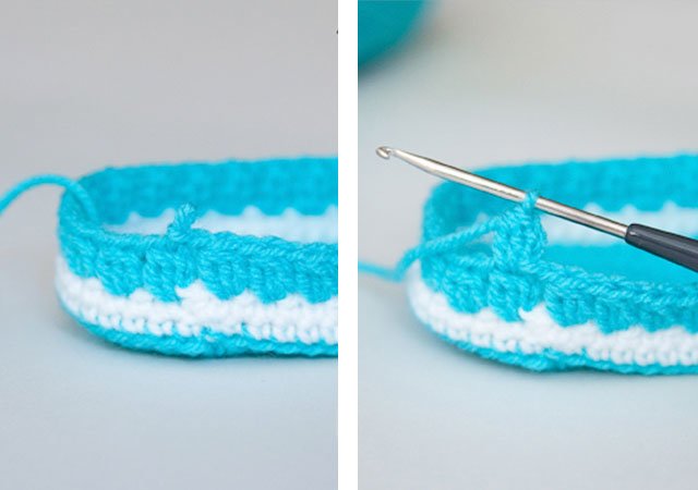 Further, without increments, 2 rows of single crochet posts. Between the rows we embroider a strip of a contrasting shade (take blue).