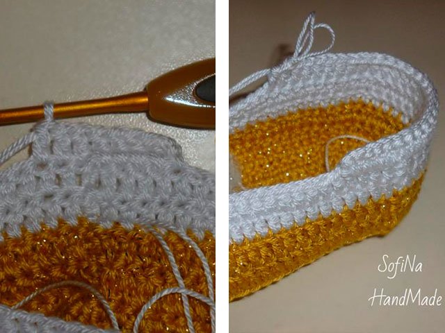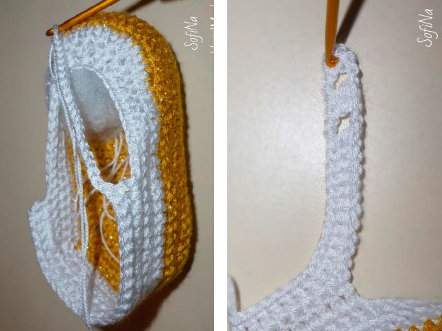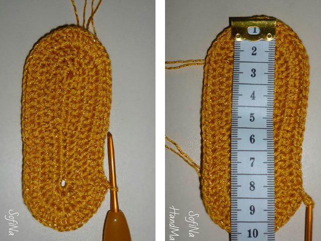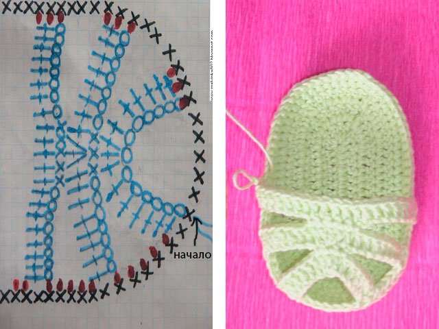 You can take any, like, cotton threads and hook number 2.5. We start from the sole (look at the diagram below).