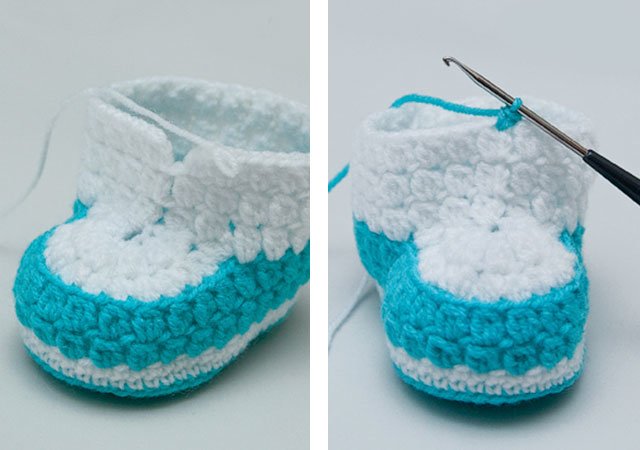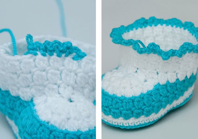 We will create tall boots or boots made of woolen yarn (weed) for a colder time. On a baby who is only a couple of months old, they will look very cute.