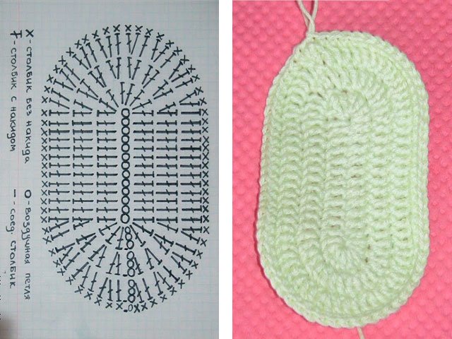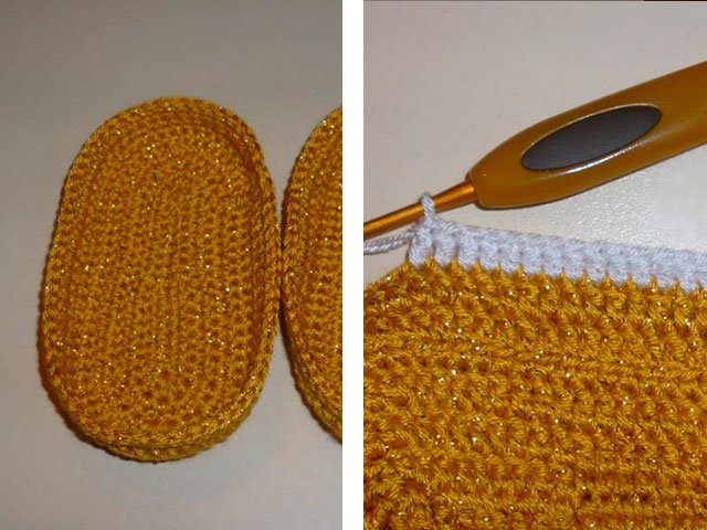5 row: 3 air loops, we knit the whole row with single crochet for the back half-loop of our sole, we end the row with a connecting column.