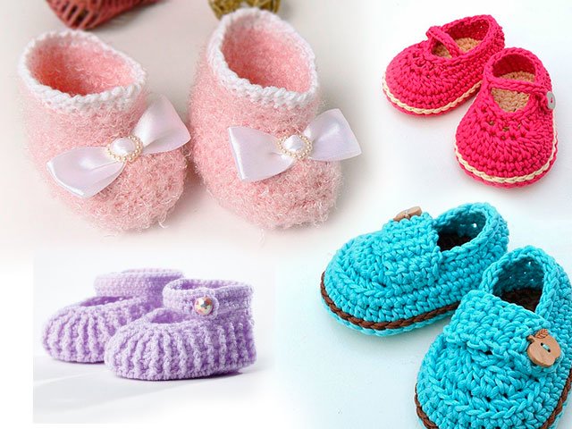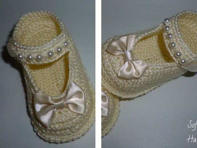 Baptismal dresses or an openwork hat will look chic complete with crocheted shoes with beads. Make them in the form of ballet shoes or moccasins. The most important thing is that the yarn is soft and pleasant for the baby foot.