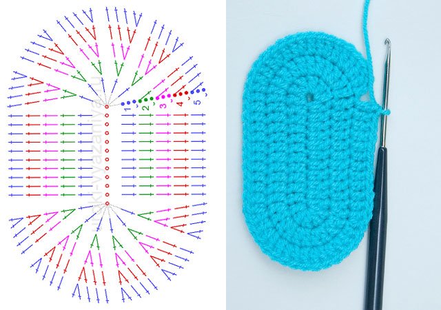 Fold the sole in half and find the middle in the bow. The middle should be 5 bars. Tie a thread with a regular knot and tie 13 air loops, then attach it to the opposite side of the spout with a half-crochet without a crochet (half-st. Bp) (distance 5 st. Bp). Next, knit according to scheme 2 (only what is indicated in blue and dark red). The nose should turn out as in fig. 3. Do not break the thread. In the last row, you hooked with 2 half-columns b.n to the sole.